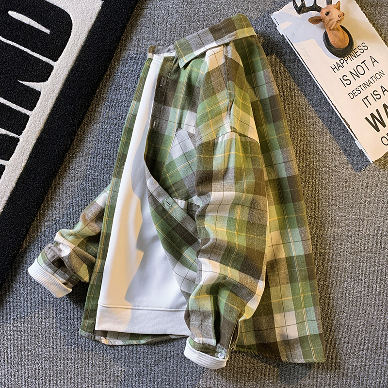 日系のレトロな緑の格子のシャツの男性のファッションブランドのゆったりとしたカジュアルな長袖のシャツの小さい大衆は色のデザイン感のコートにぶつかります。