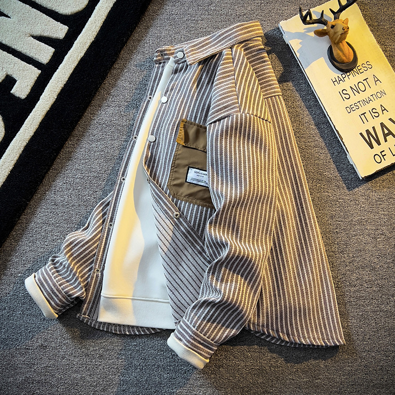 日系縦縞シャツ男潮牌痞帅ゆるいカジュアルスーツシャツ小衆ポケット衝突色デザインコート