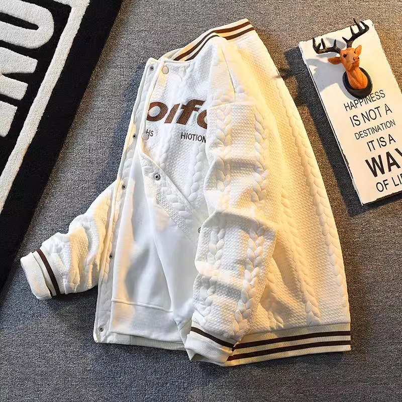小香風麻花野球服男性ニットコートのデザイン感があります。
