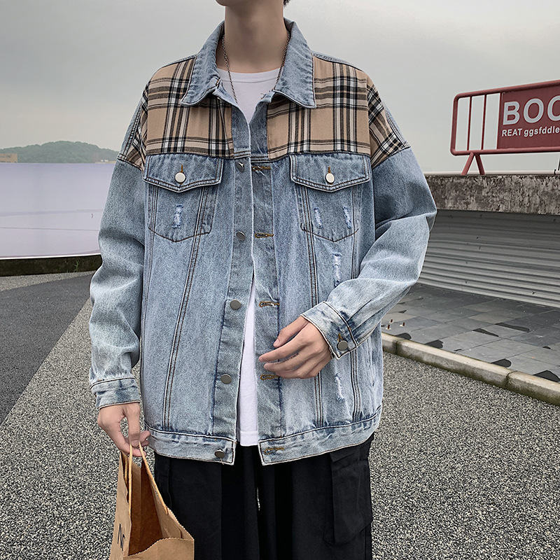 春秋の新型の香港風のデニムのジャケットの男性のゆったりしているごろつきのかっこいいつなぎ合わせの上着のファッションのinsの高級感のコート