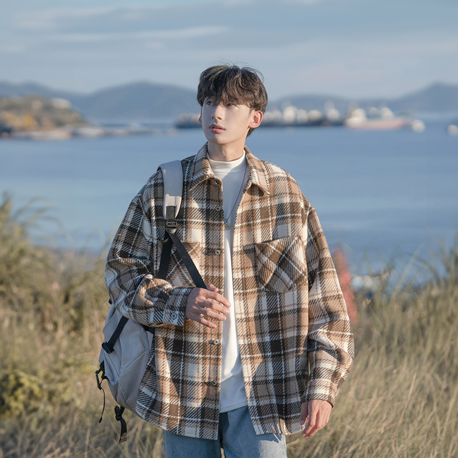 小香風折り襟格子シャツコート男性24秋の新型百合ゆったりカジュアル高級感シャツ男性
