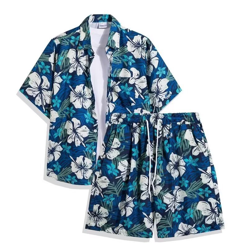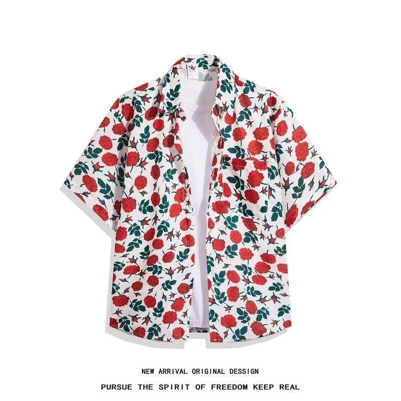 香港风レトロローズ花フルプリント半袖シャツ2024夏威夷ビーチ风カップルパンツスーツメンズ
