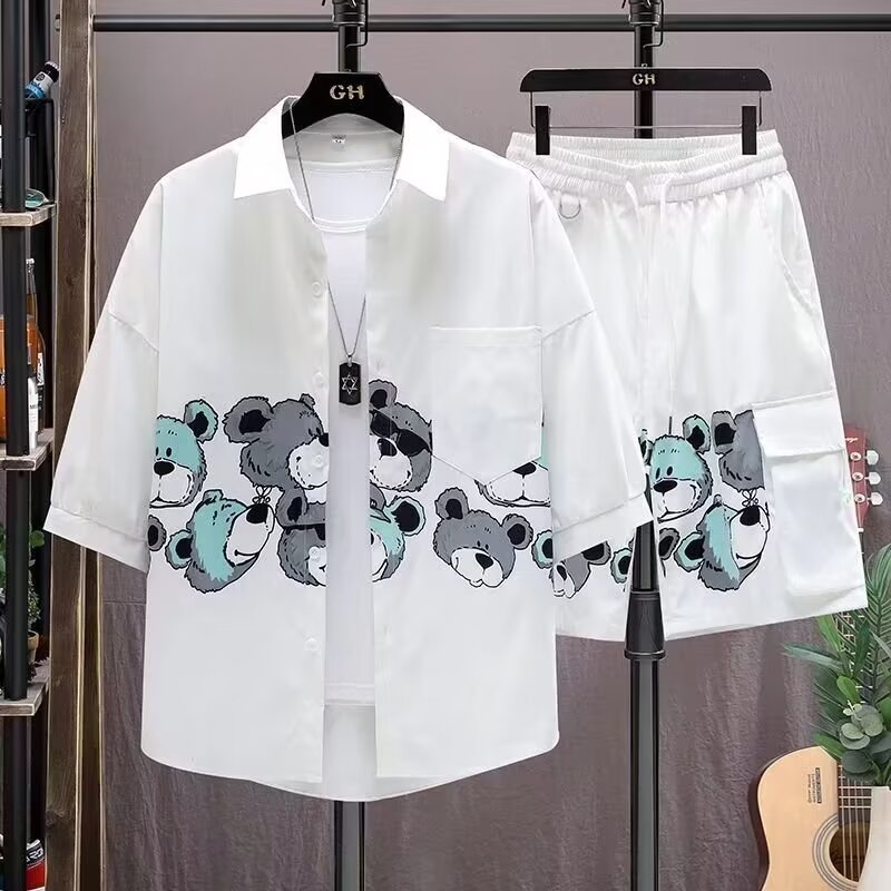 グラデーション色のアニメプリント2024夏シャツ男性青年半袖シャツ潮牌士五分袖薄いコート