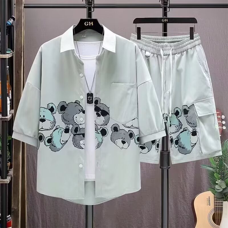 アニメプリントシャツ男五分袖潮牌ゆるい半袖シャツ男2024夏の薄い上着