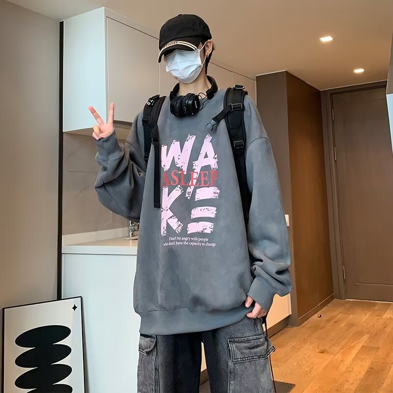 2024春秋の新型ファッションの格好いいカジュアルな丸首の字のゆったりした母のプリントのカップルのパーカーの男性の上着