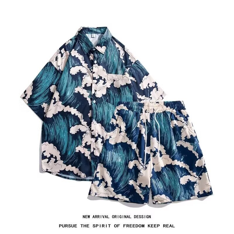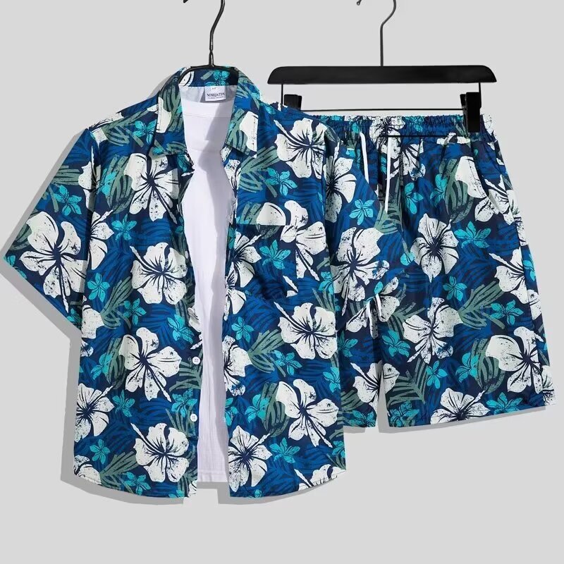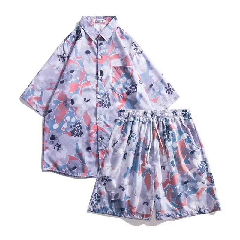 爆街港風復古花シャツセット男2024夏青少年ビーチ休暇海辺ファッションセット