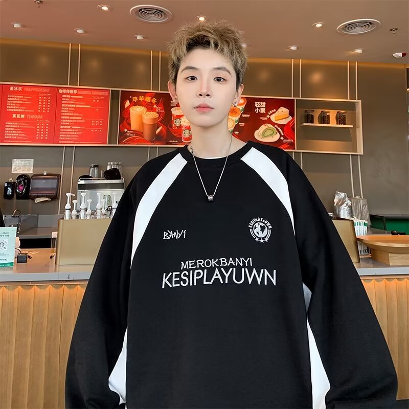 2024春秋の香港風の新型のファッションファッションの百合のアルファベットの刺繍の衛衣の格好いいゆったりしている丸首の上着の男性