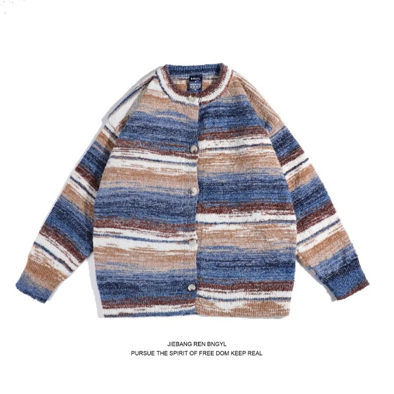 虹のストライプのニットのカーディガンの男性のセーターのコートの2024春と秋のファッションのボタンのカーディガンは色のセーターの上着にぶつかります。