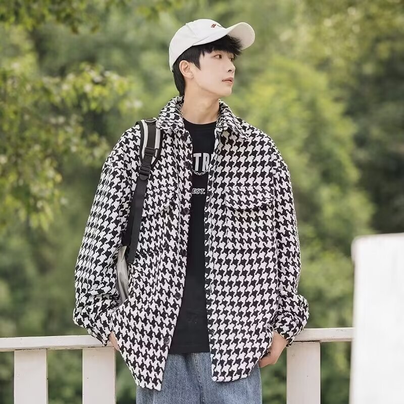 百合港風襟ジャケット2024年春の新型男性ゆるい格好ファッション千鳥格カップルコート男