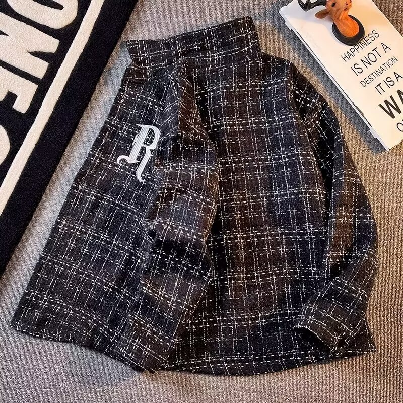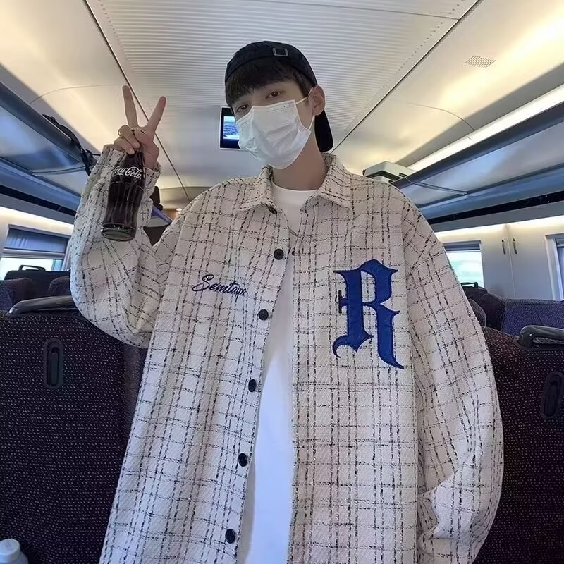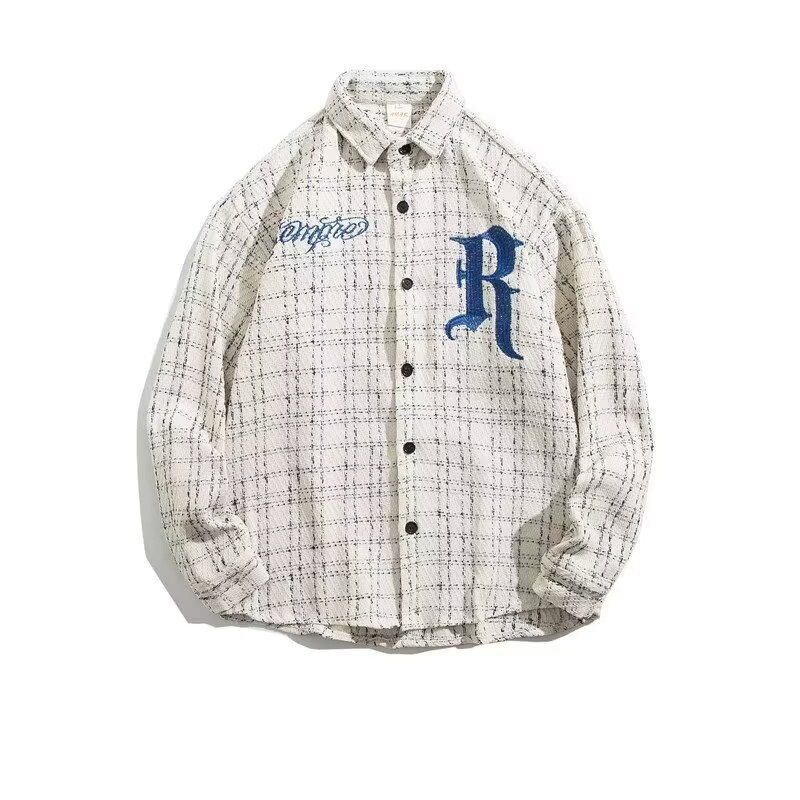 2024春秋アルファベット刺繍格子潮長袖シャツ男百合高街痞帅高級感ゆるいコート