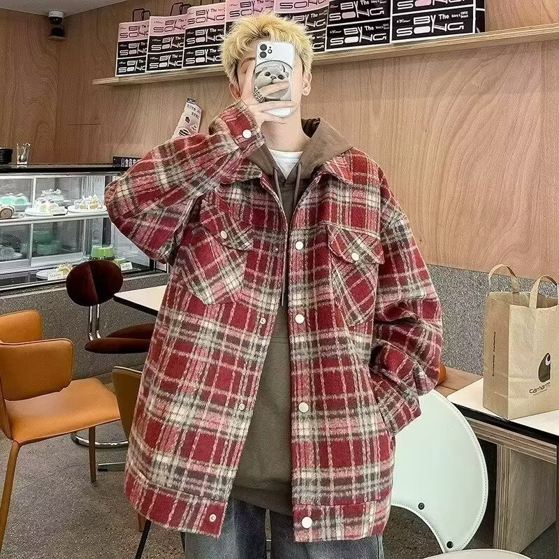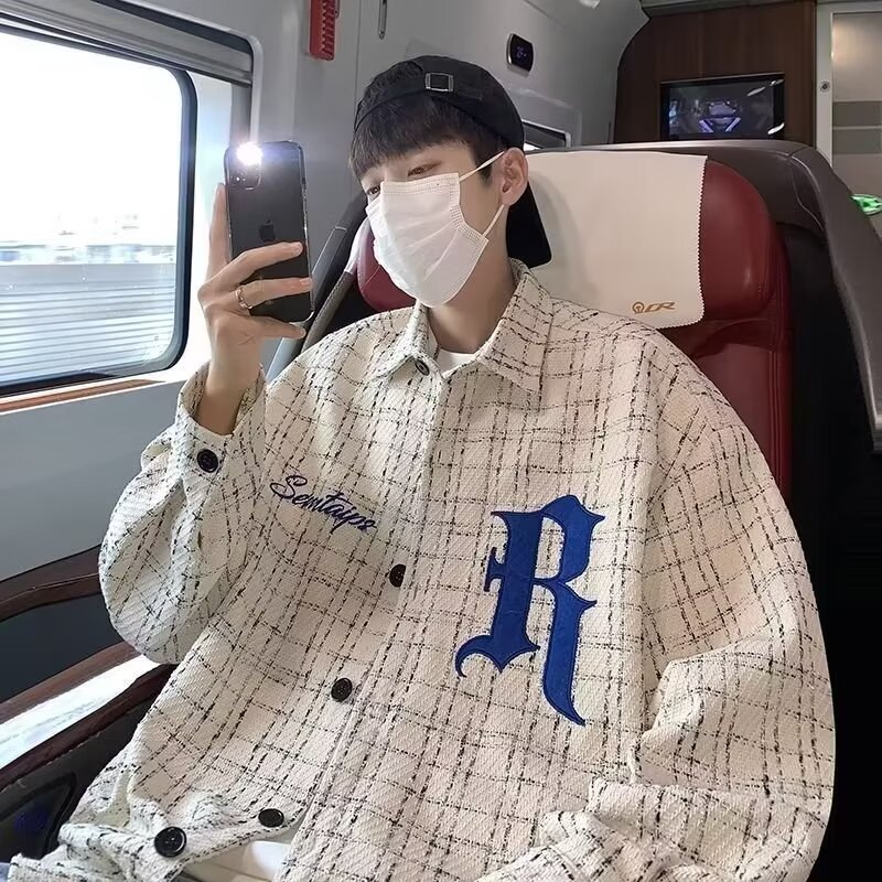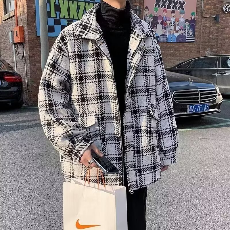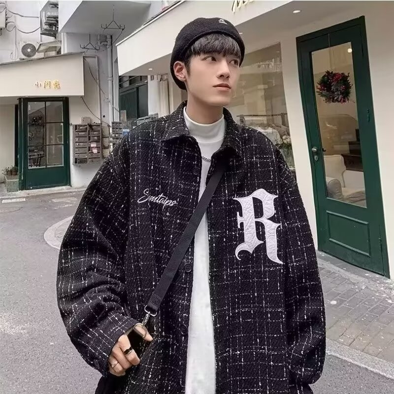2024春秋格子カジュアルゆるいジャケットかっこいいファッションゆるい襟付きメンズ学生ジャケット男性