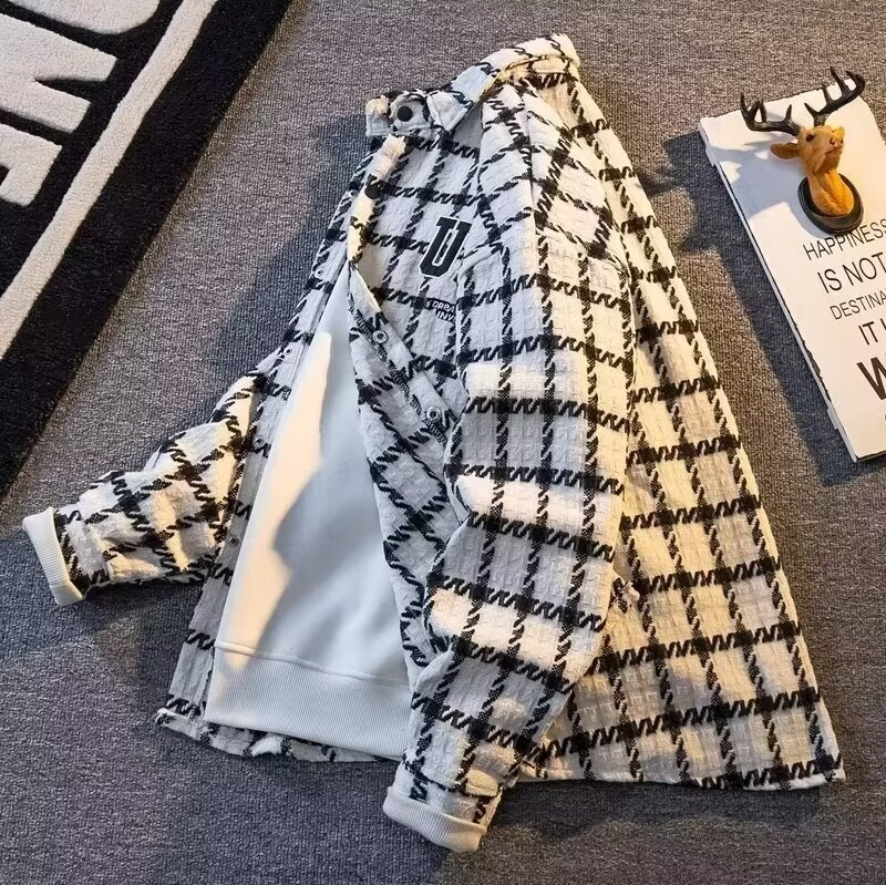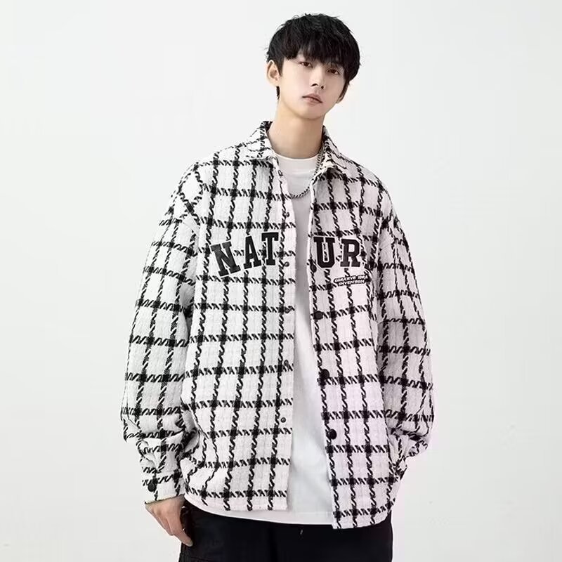 2024新作春秋折り襟シンプル潮牌シャツ青春流行トレンドゆるい格子ゆるい上着