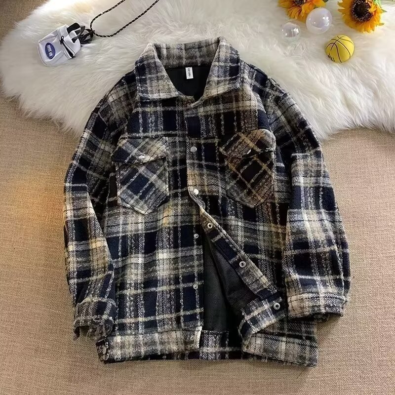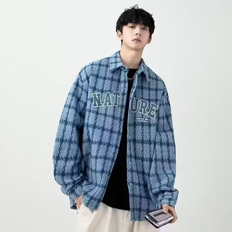 アメリカのレトロな青い格子シャツ男2024冬の新しいゆるい大衆デザイン感シャツジャケット