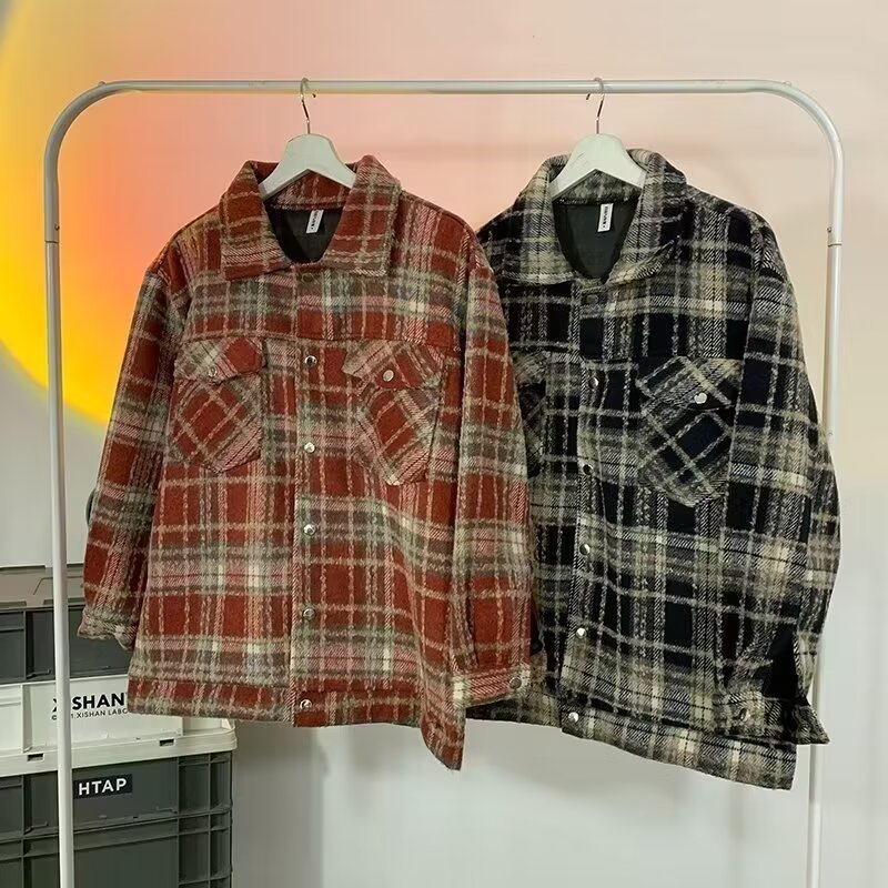 小香風ですね。ジャケットのコートは2024新型春秋モデルのカジュアルなレトロな色合わせカップルのゆったりした格子シャツ男です。