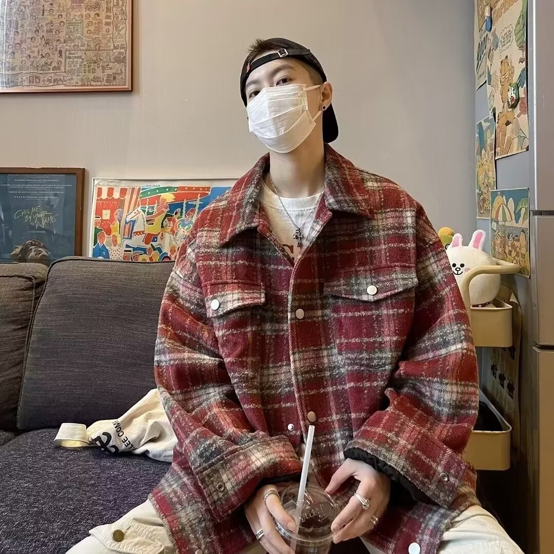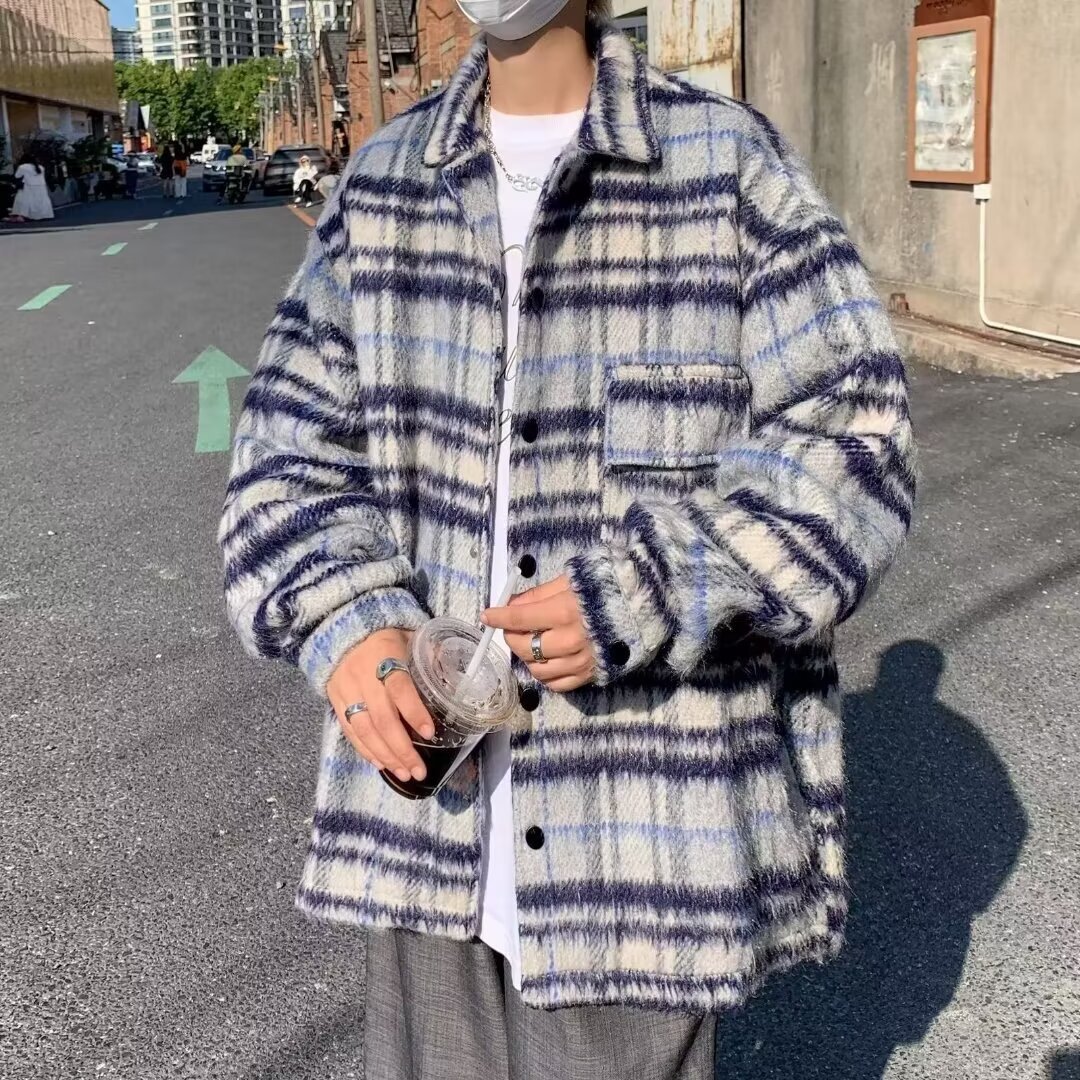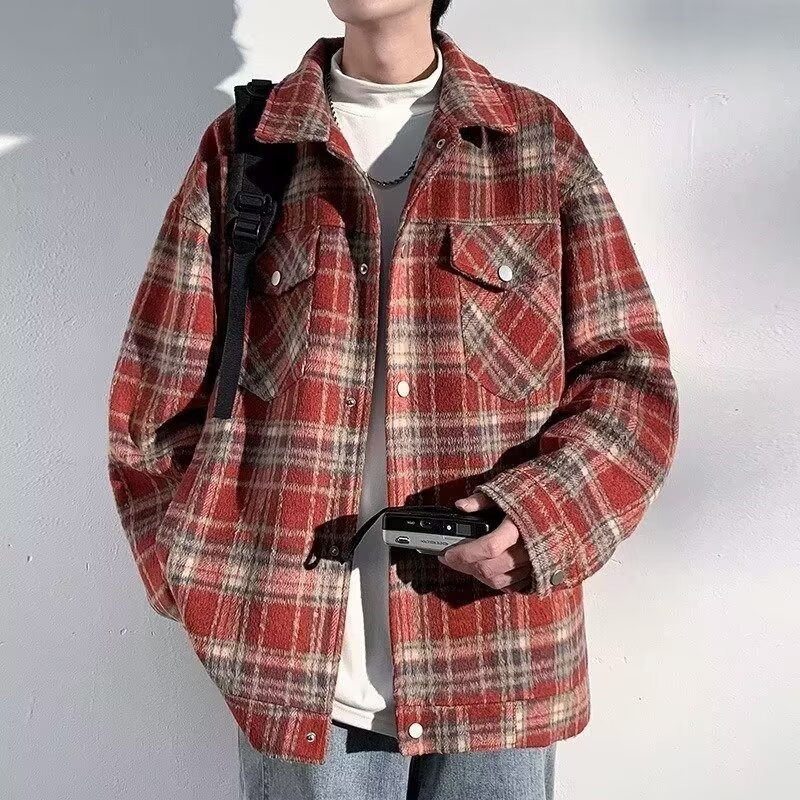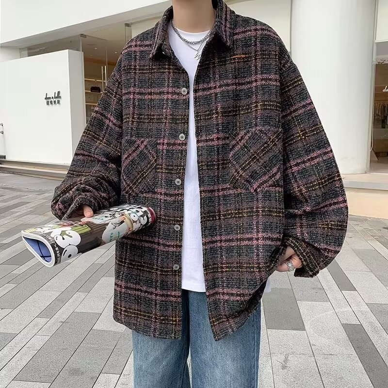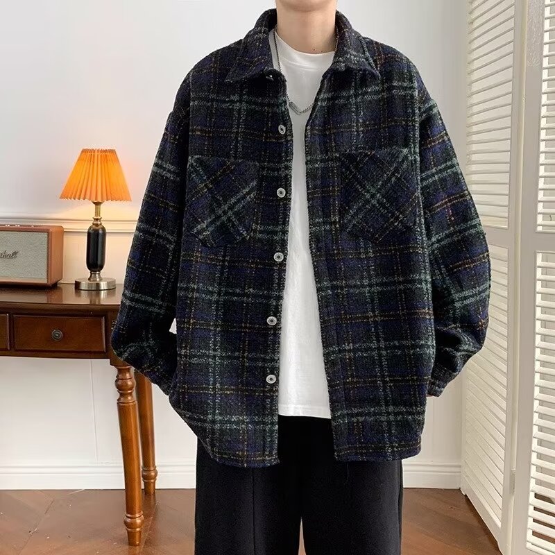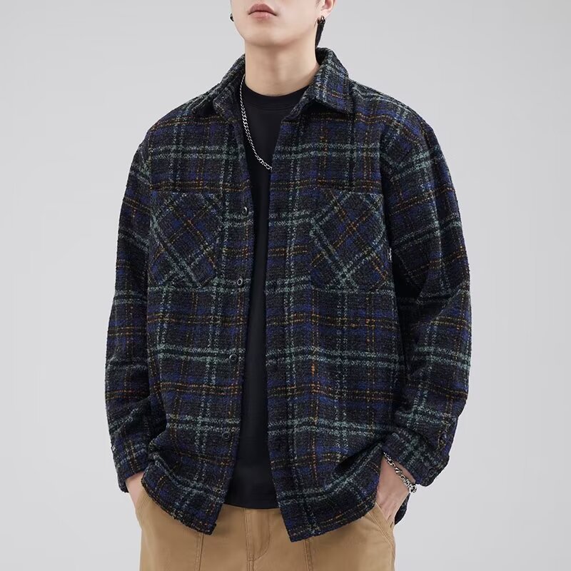 アメリカのレトロなコンビネーションの格子のコートの男性の秋冬の2024の新型の怠惰な風のカジュアルな工装のシャツの男性
