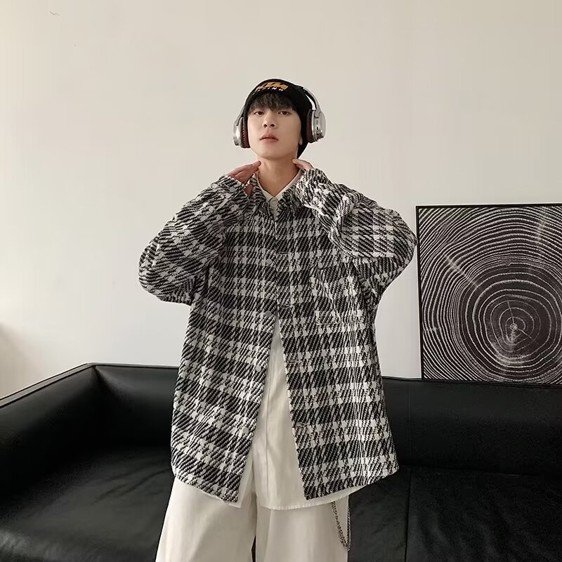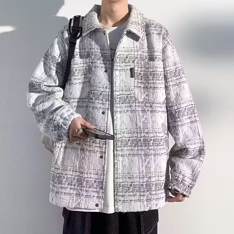 小香風コート男2024春秋潮牌高級感襟襟上着レトロな日系格子シャツ男性