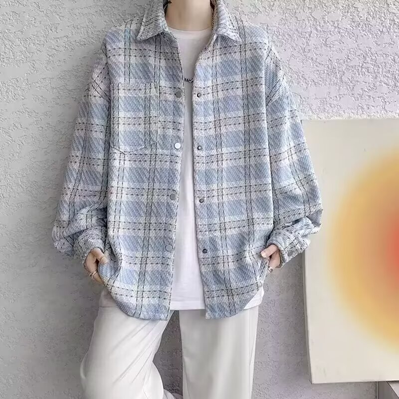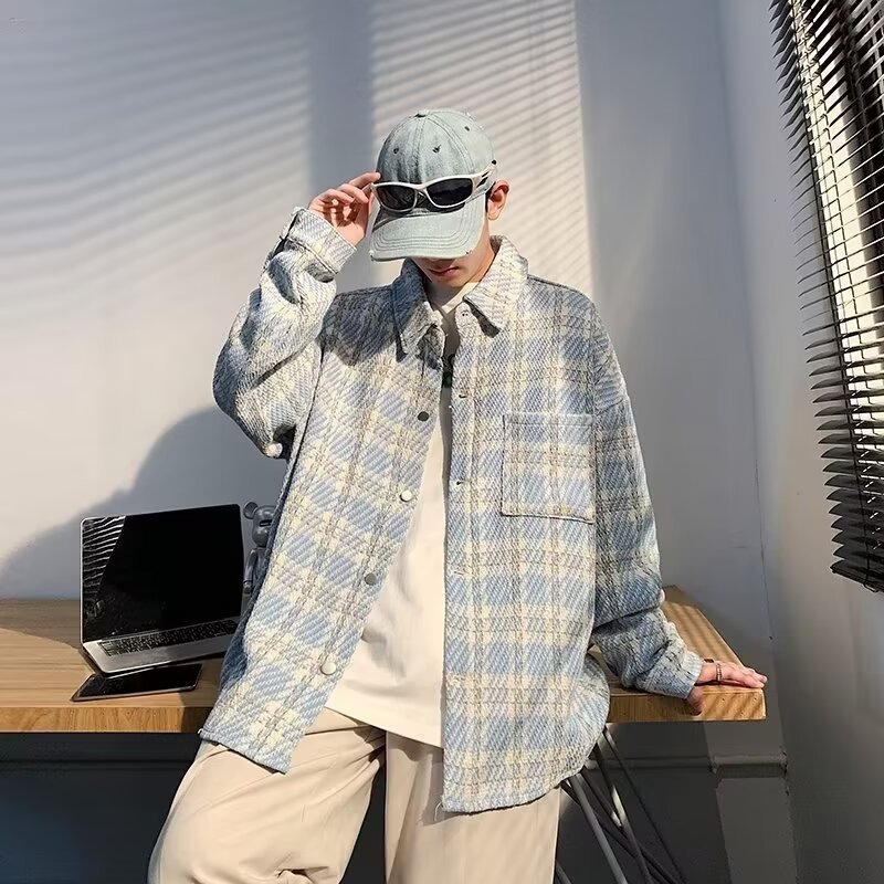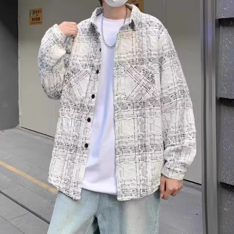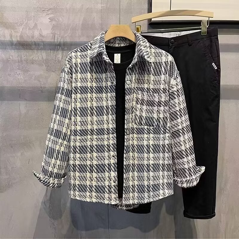 高級感小香風格子襟付きシャツコート男性春秋カジュアルカップルジャケット男性ブーム