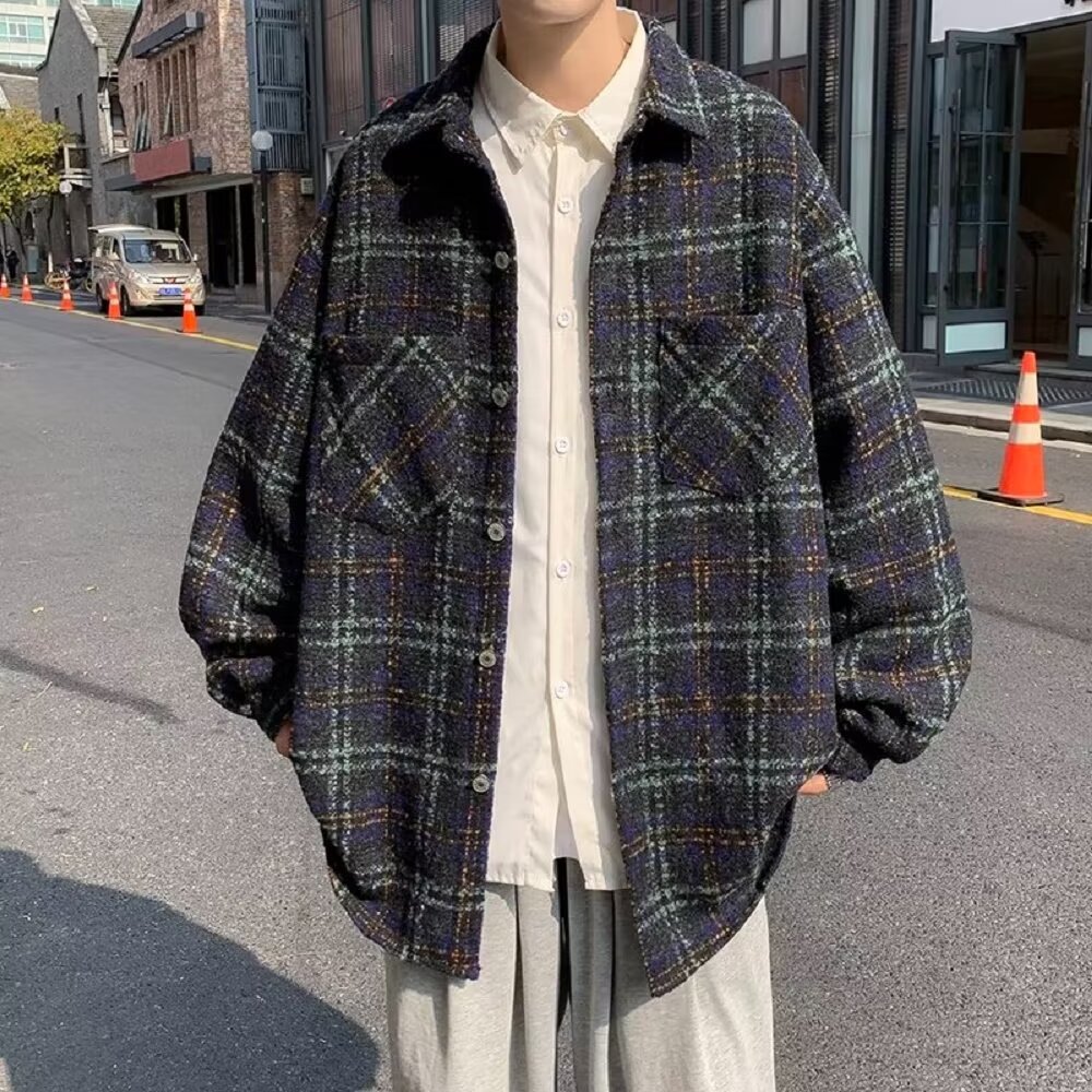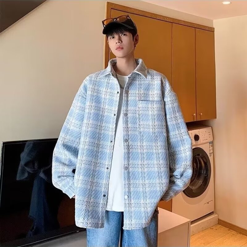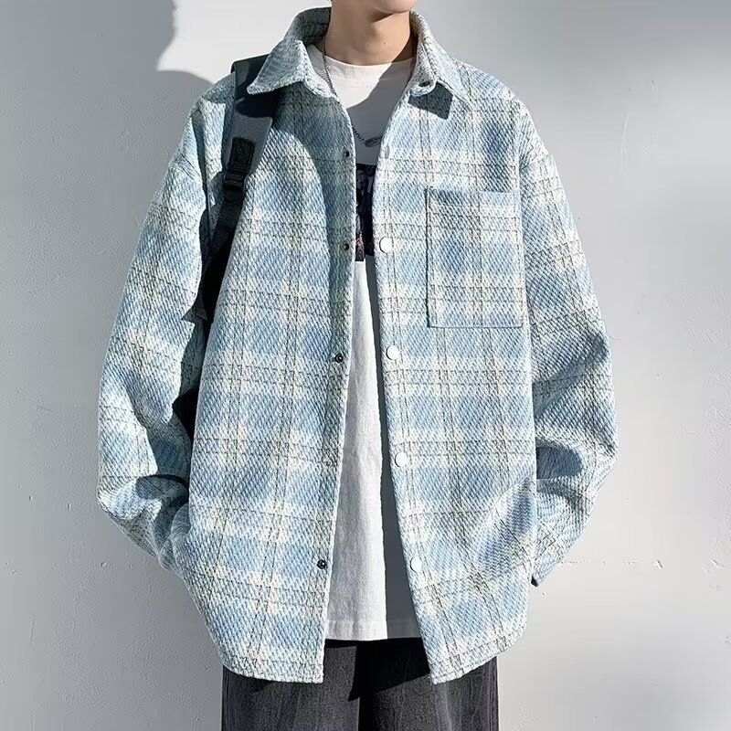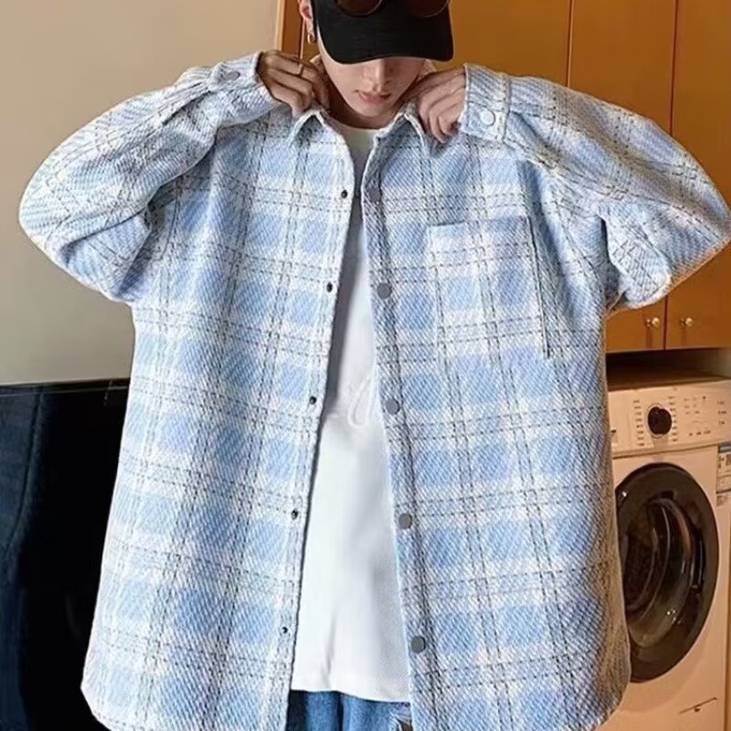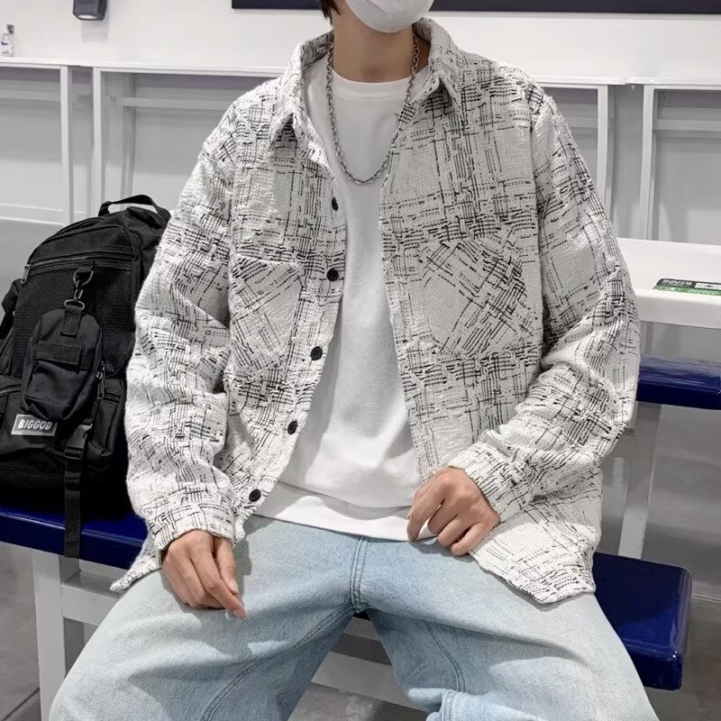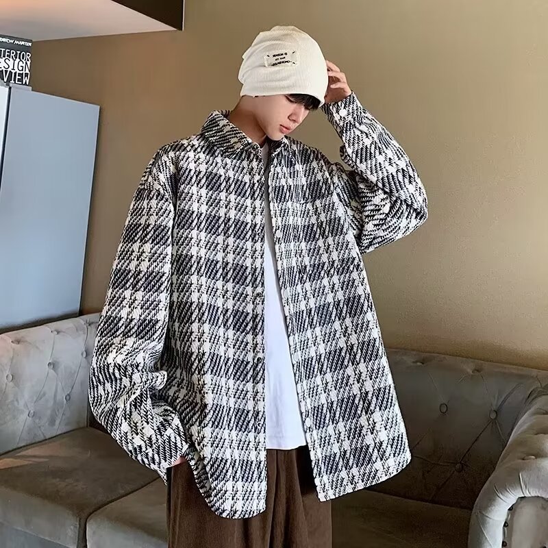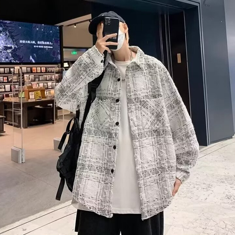 香港風長袖シャツ2024新型春秋男性カジュアルファッションブランドゆるい襟付き格子ジャケット男性コート男性