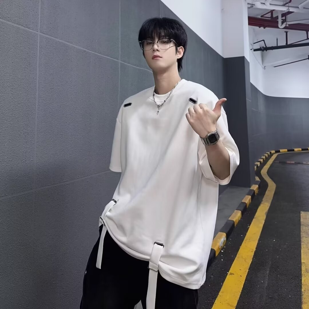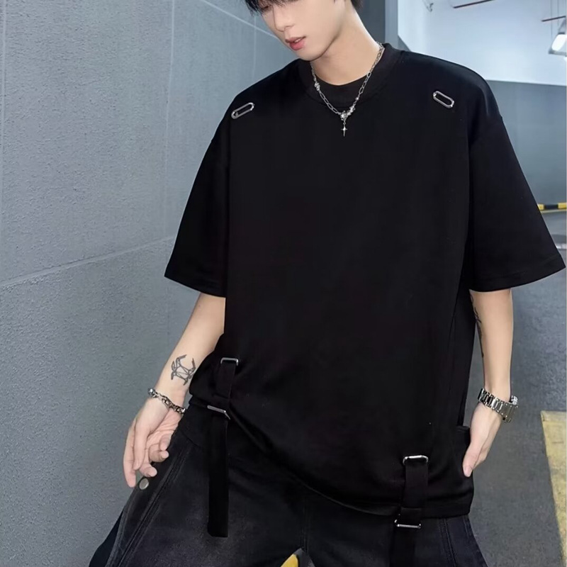 大衆デザイン感ストラップtシャツ2024夏の新型男女トレンドゆるい半袖上着五分袖上着