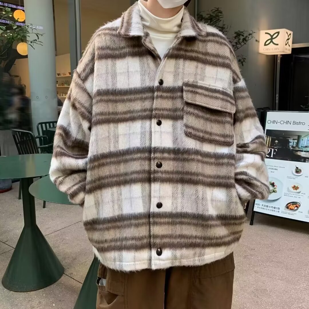 日系レトロ高級感コート男春秋新作小香風格子シャツジャケット潮牌カップル服男