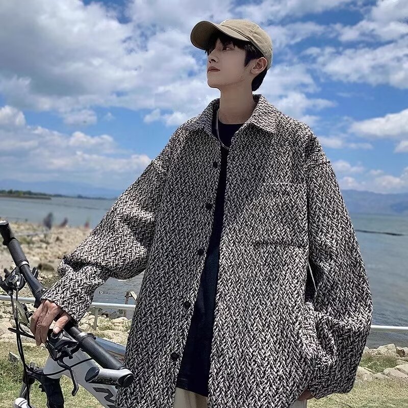 棋盤格の格好いいジャケットの男性モデルの春と秋の2024の新型のゆったりしているメンズのアメリカ式のカジュアルな秋服のコート