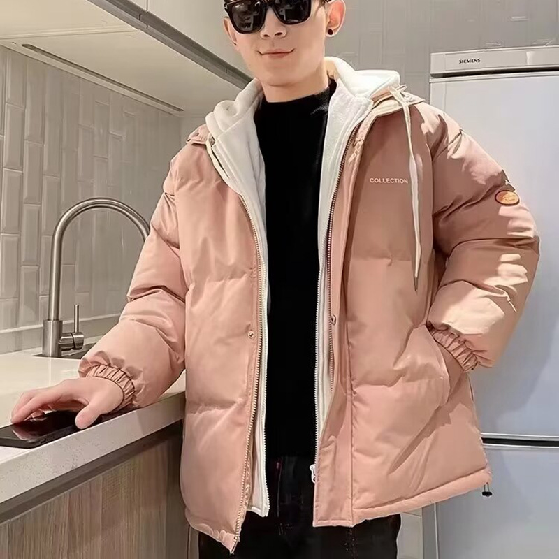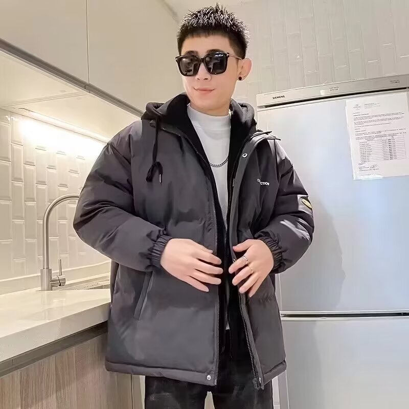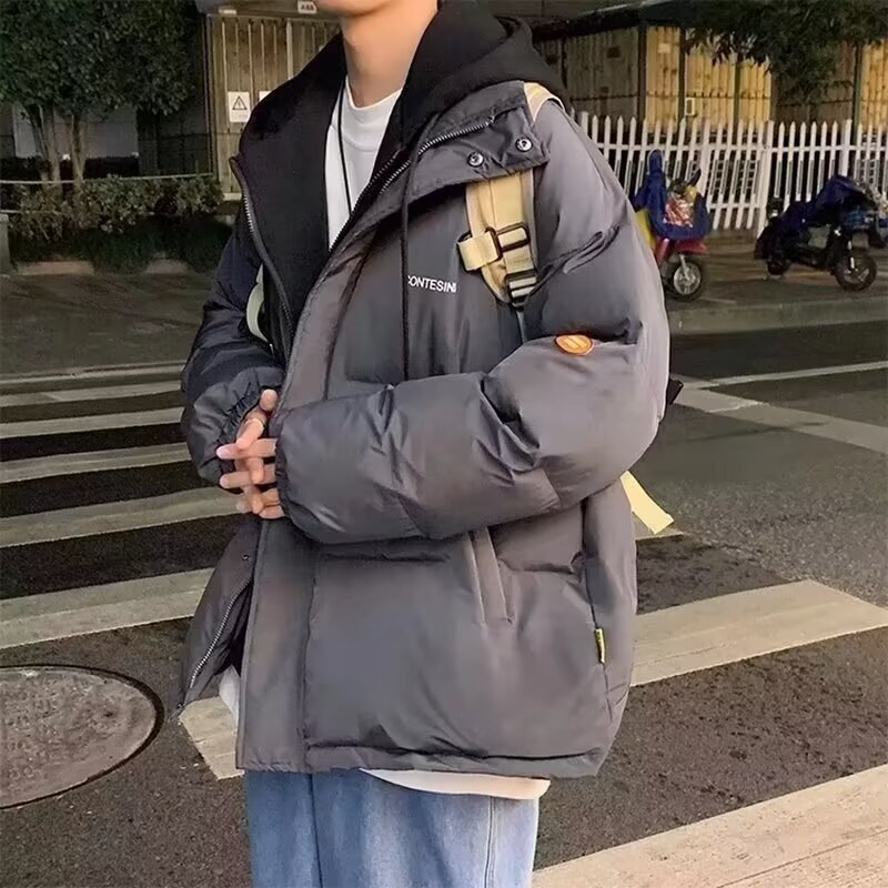冬の日系の新型百合綿服の偽の2つの綿服は厚い青年の男性のゆったりしている保温の帽子のコートの男性を厚くします。