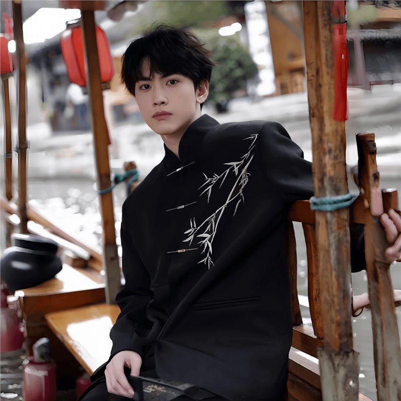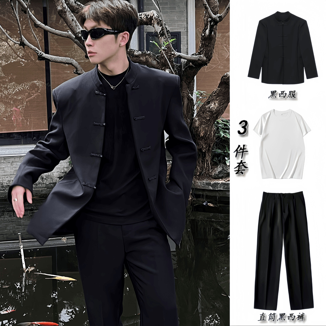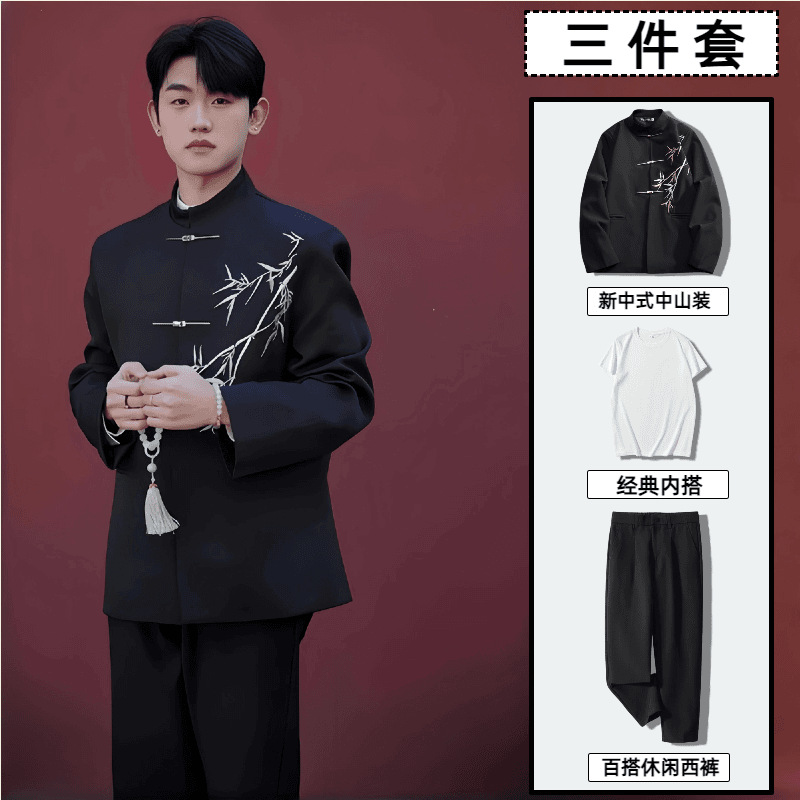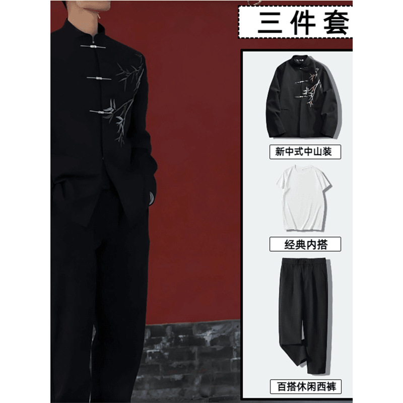青年男性立襟レトロ洋服カジュアル新中国式中山装中国風新郎スーツセット高級感