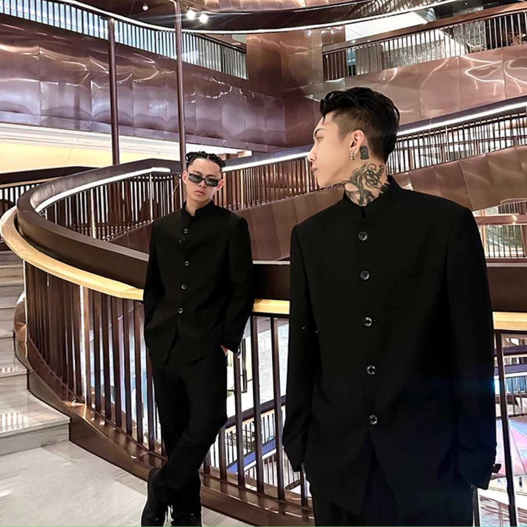 2024格好いい新中国式カジュアル青年服立襟中山服男性服セット痞帥高級感レトロ上着男性