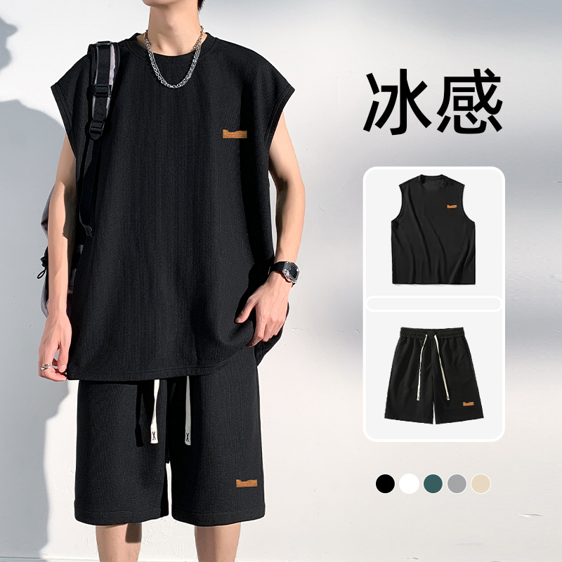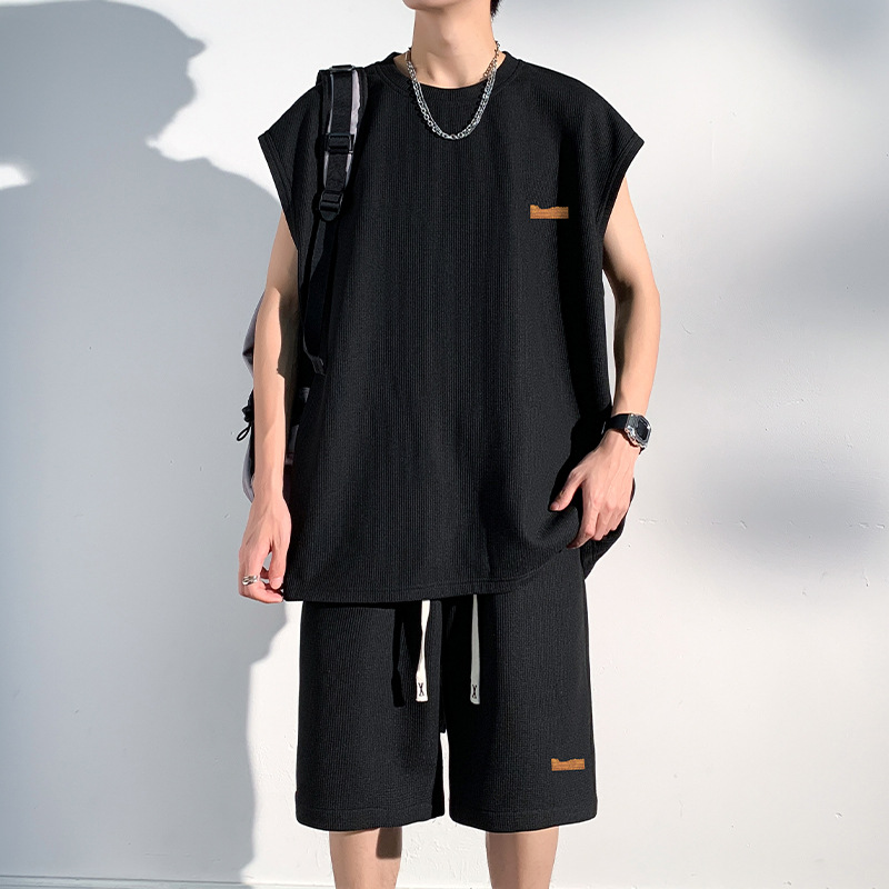 百合セットの夏の男性の新しい丸首の肩のベストの潮流の香港風の男性のタイプの夏の潮のブランドのごろつきの帥の1セット