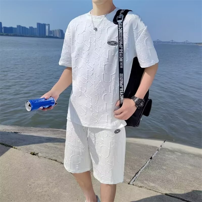 カジュアル2点セットジャカードアルファベット半袖tシャツ男カジュアルins潮ゆるいスポーツビーチ広脚パンツセット