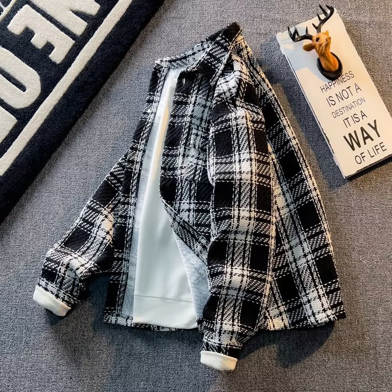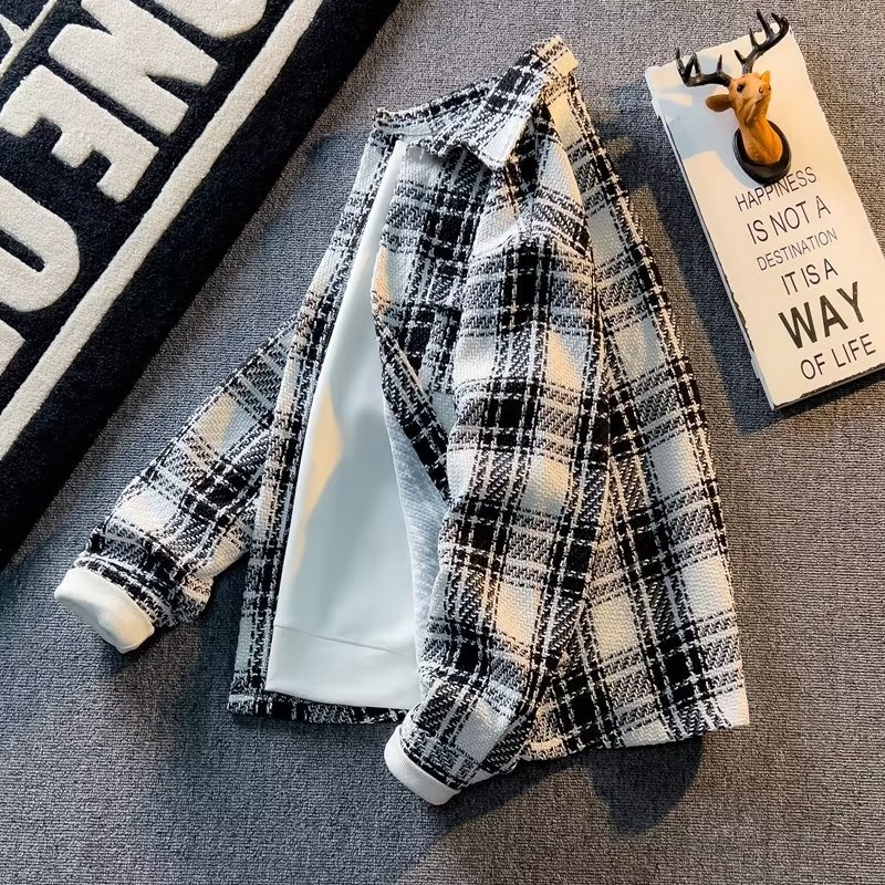 ヴィンテージ高级感小香风チェック柄ジャケットメンズinsハイストリート潮学生ジャケット春秋折り襟シャツ