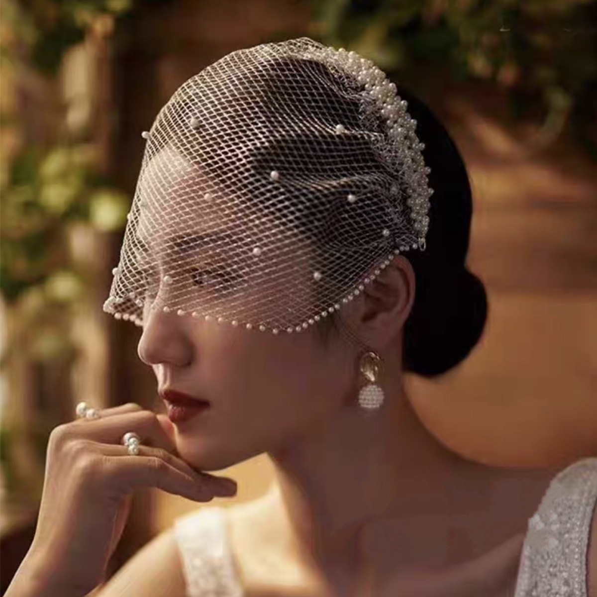 クロスボーダー热い贩売花嫁ベール真珠のウェディングドレス写真撮影旅行撮影高级シンプルなファッションレトロ手作りV152