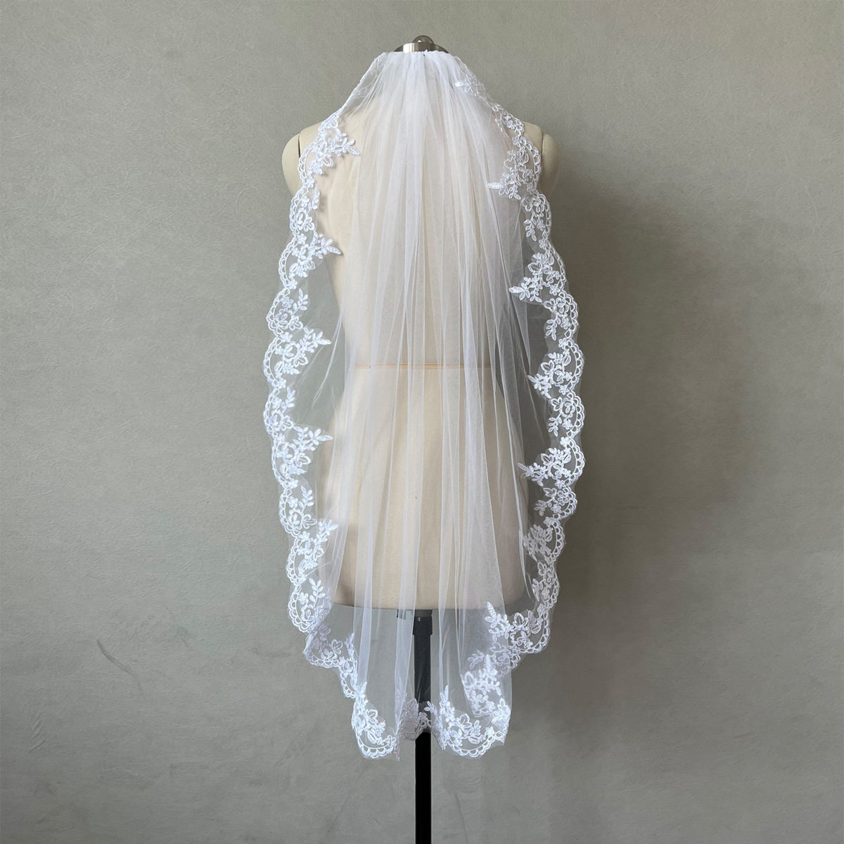 欧米の花嫁の単層のベールの網の糸のレースの結婚式のドレスは結婚の写真を飾って卸売りしますv80