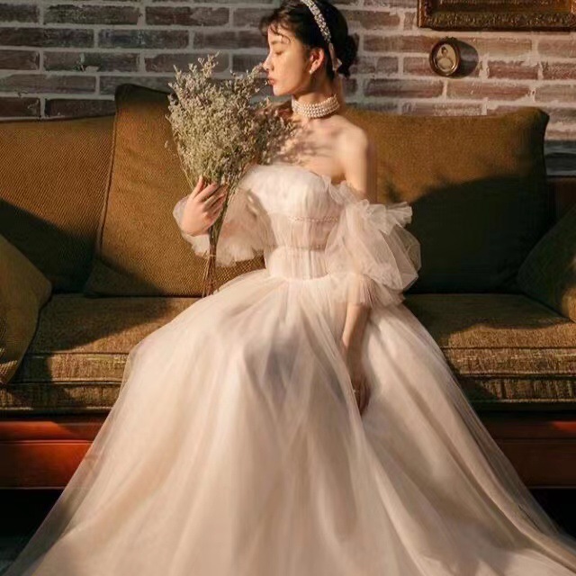 花嫁の泡袖の長いサテン真珠レトロ高級宮廷風ドレスのウェディングドレスの写真撮影v63