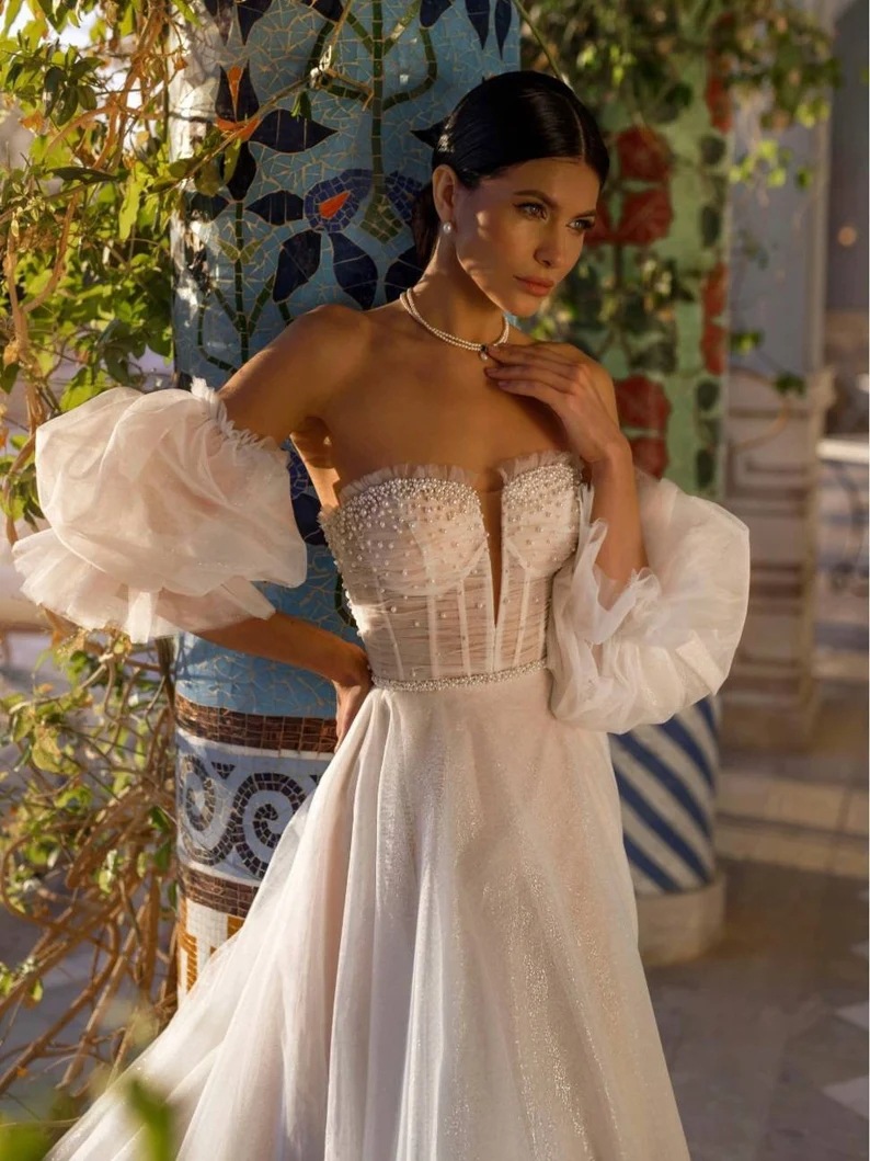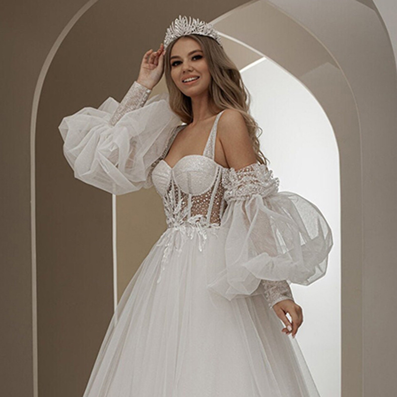 欧米の花嫁の網の紗の泡の袖の長さは胸のドレスのウェディングドレスの撮影の写真を拭きます。