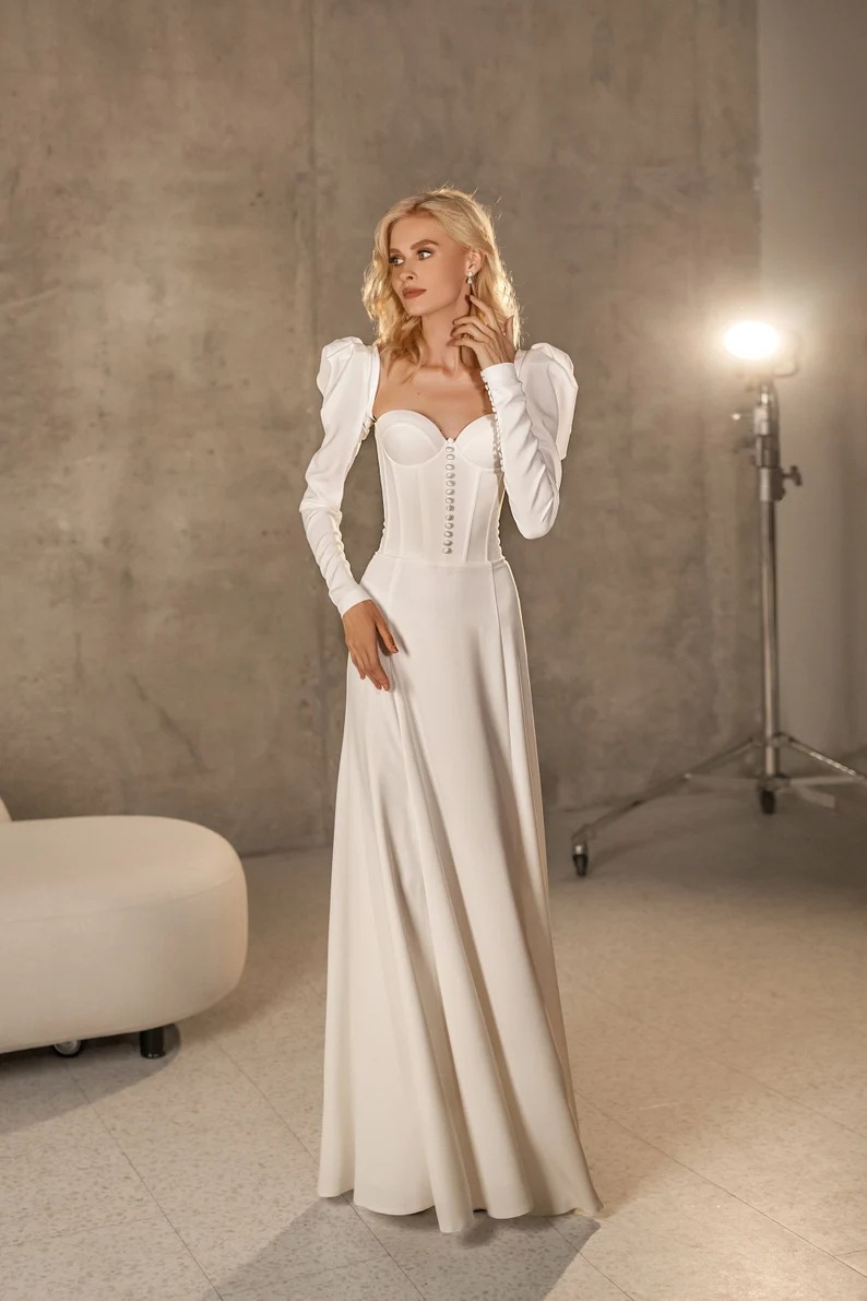 ウェディングドレスの袖のサテンの長袖は胸を拭きます。