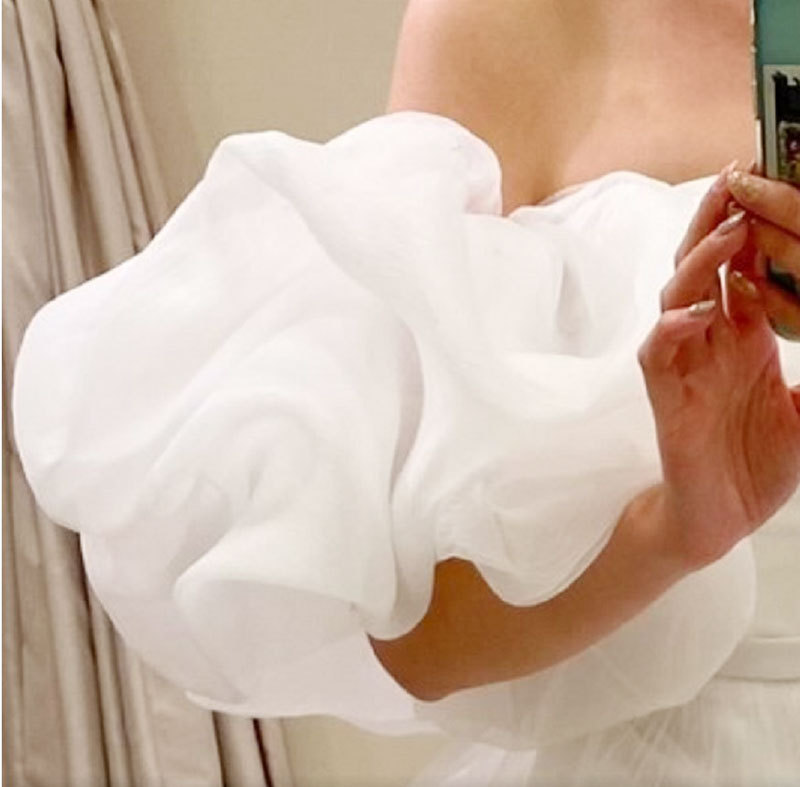 蝶結びは肩を隠してウェディングドレスを飾ります。