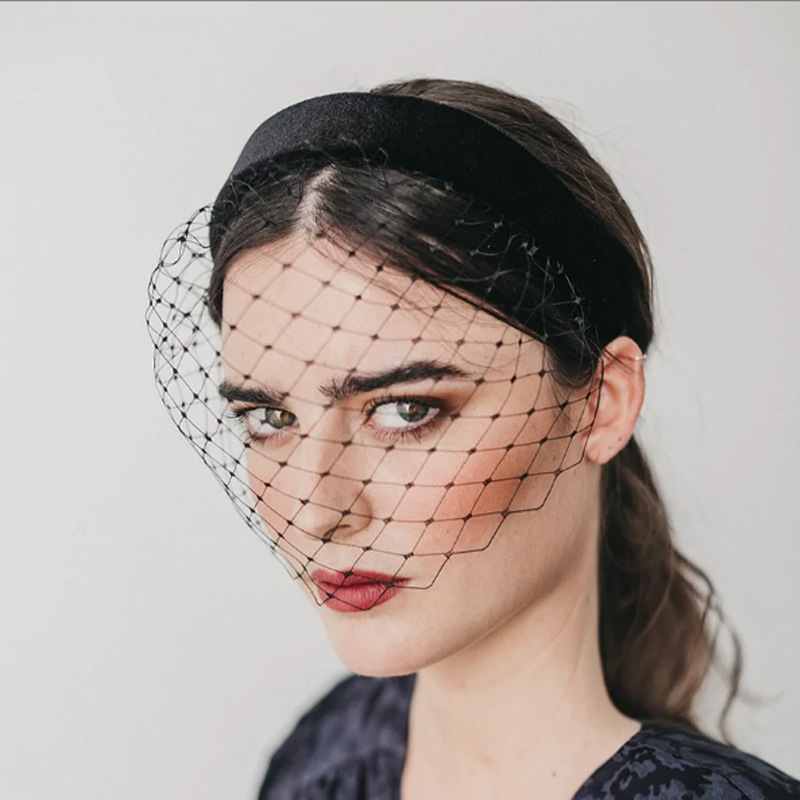 速売通の爆発金は欧米のビロードの広いカチューシャの鳥かごのベールの黒い顔のベールの撮影の結婚式の髪飾りです。