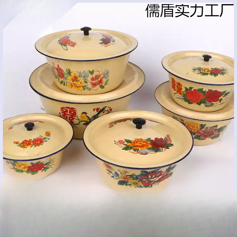 古いエナメル盆蓋付きスープ鍋エナメル餃子あんかけボウル調味料ボウル練り薬深み手洗いボウル豚滝意試合