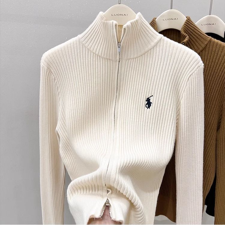 高襟双ファスナーニット女性春2024新カーディガン厚手セーターゆるい長袖上着女性コート