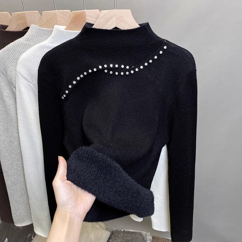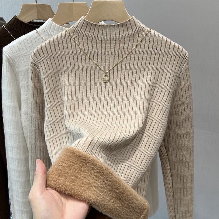 ベルベットの厚い一体ベルベットのセーター2024の新しい秋冬の保温ニットの半高襟のシャツの女性の下着