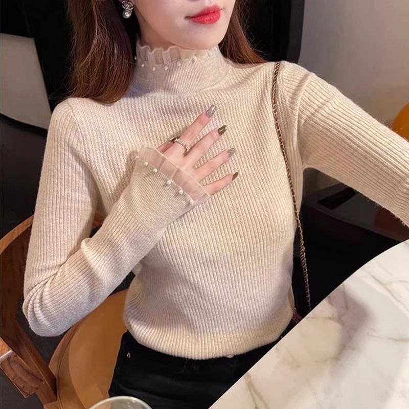 半高襟のレースの底のシャツの女性の春秋の中で2023新型のファッションの洋風の修身のセーターのニットの上着を掛けます。