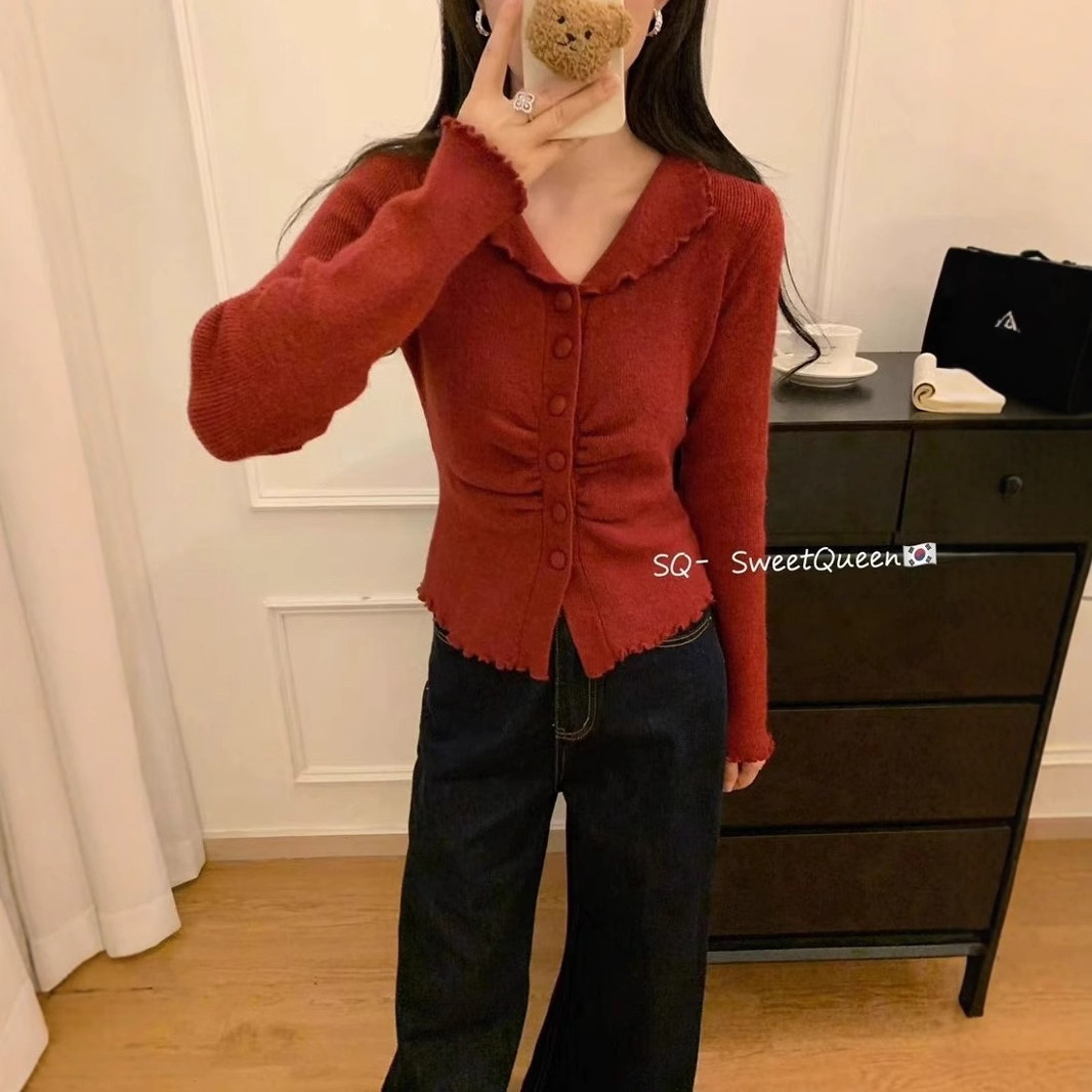 秋冬の新型の木の耳元のしわは身を修めてやせているニットのカーディガンの女性のクリスマスの祝日の甘いギャルの小さいセーターを現します。