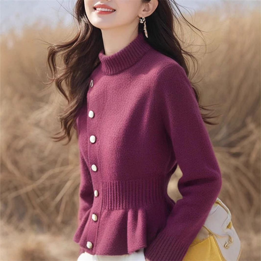 フランス式のスタンドカラーの雰囲気感が厚いセーターの女性は冬にとてもきれいで、腰のニットの服を収めてスリムに見える上着を身に着けます。