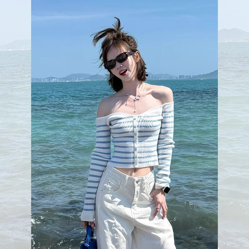 純欲風一字肩のストライプのニットの女性の春のデザイン感があります。