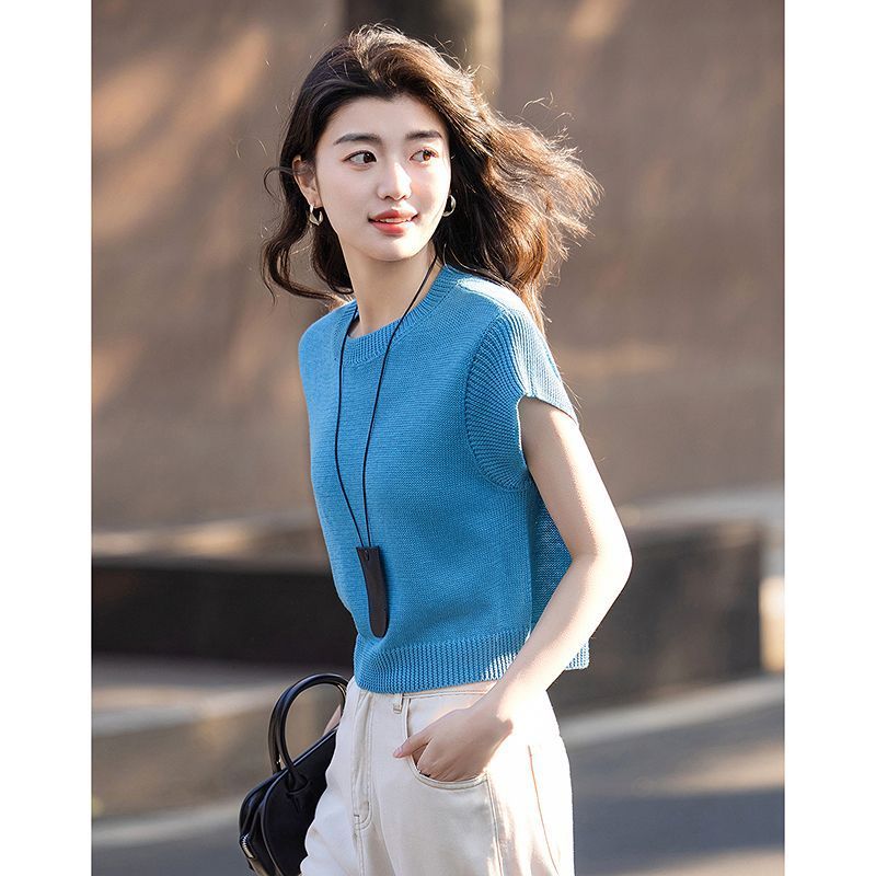 韓国版シンプル半袖ニット上着女性春夏タイプカジュアル百合ゆるい短い丸首プルオーバーセーター