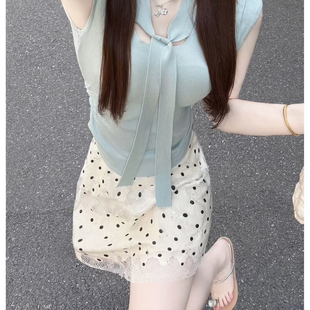 フレンチVネックレースアップアイスシルクニット半袖Tシャツ、夏の女性用、ユニークで超見栄えの良い、小柄なスリムフィットノースリーブトップ
