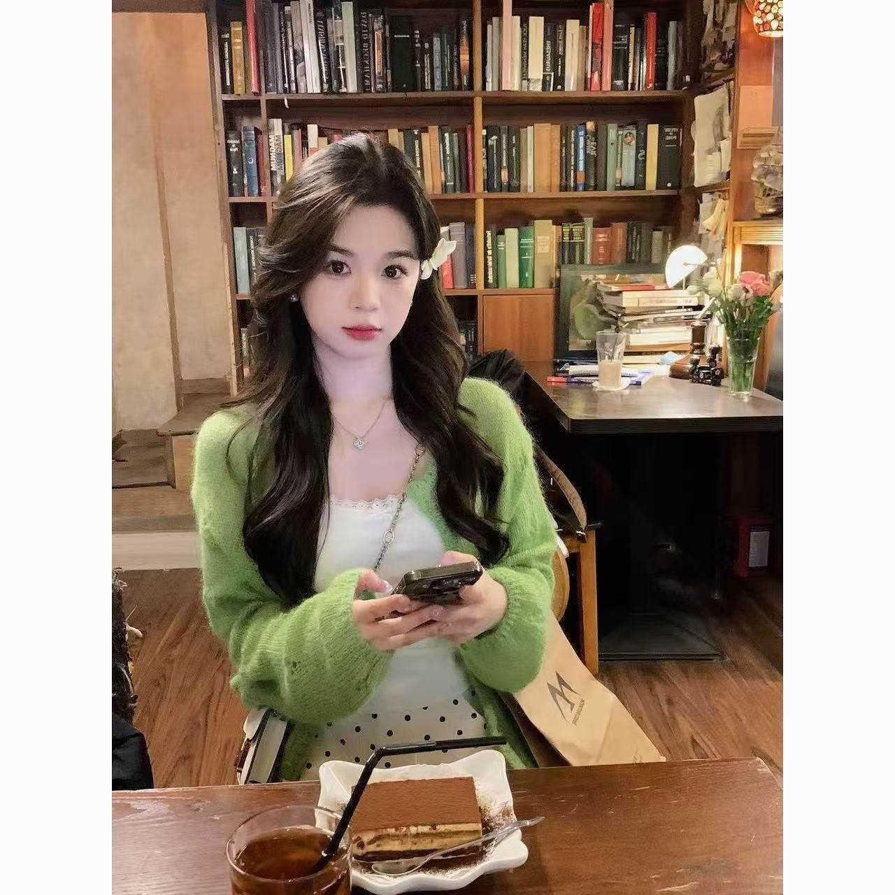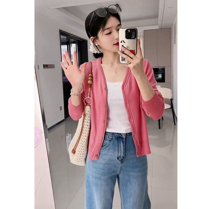 人気の純粋な欲望スタイルの女性用Vネック軽量ニットカーディガントップ、韓国風、多用途、内外ショートシャツ