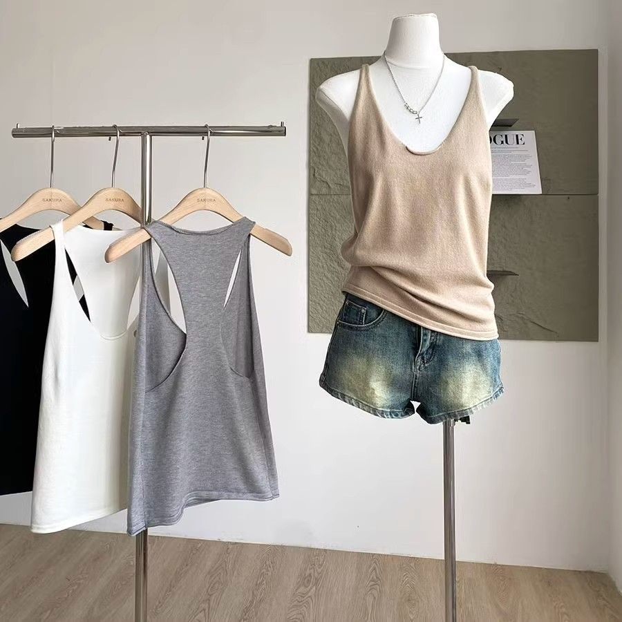 レトロな灰色の工字ストラップベスト女性の夏の修身袖なしの外着デザイン感ギャルニットの底付き上着