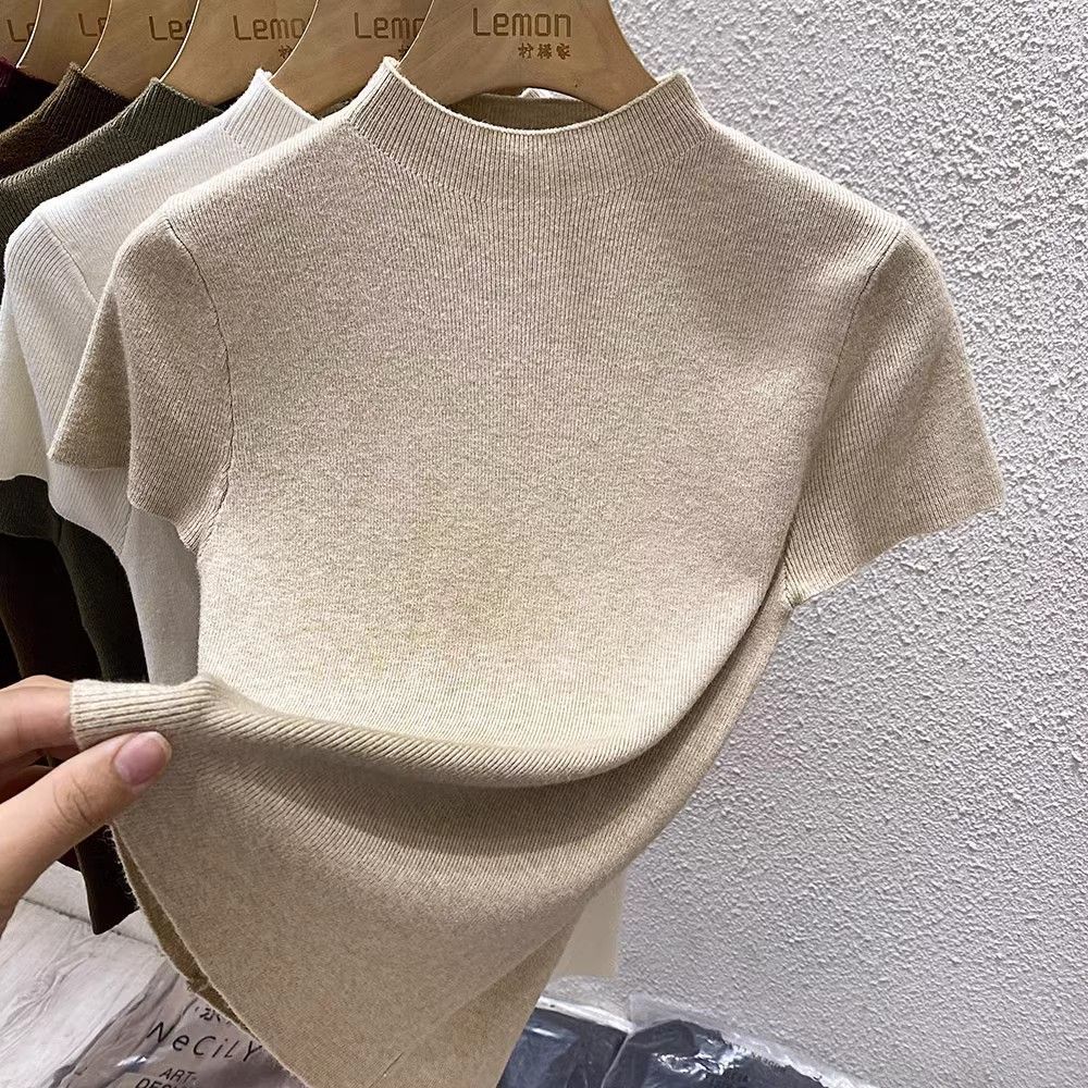 高級感2025年夏の半高襟のニットtシャツの女性の小衆の中に純色の修身半袖の上着を掛けます。